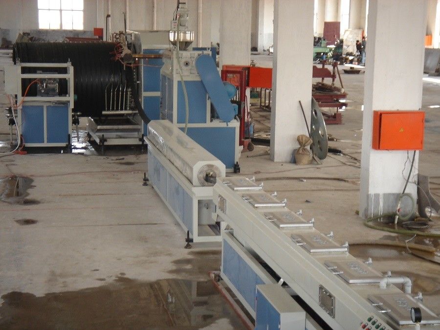 Dây chuyền ép đùn ống này bao gồm máy đùn, đầu khuôn, khuôn, máy tạo hình xoắn ốc, khuôn đúc, máy ép keo, hệ thống hiệu chỉnh chân không, bình phun nước, máy cắt, khung lật và hệ thống kiểm soát toàn bộ đường dây.