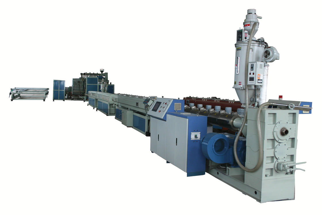 Dây chuyền ép đùn ống này bao gồm máy đùn, đầu khuôn, khuôn, máy tạo hình xoắn ốc, khuôn đúc, máy ép keo, hệ thống hiệu chỉnh chân không, bình phun nước, máy cắt, khung lật và hệ thống kiểm soát toàn bộ đường dây.