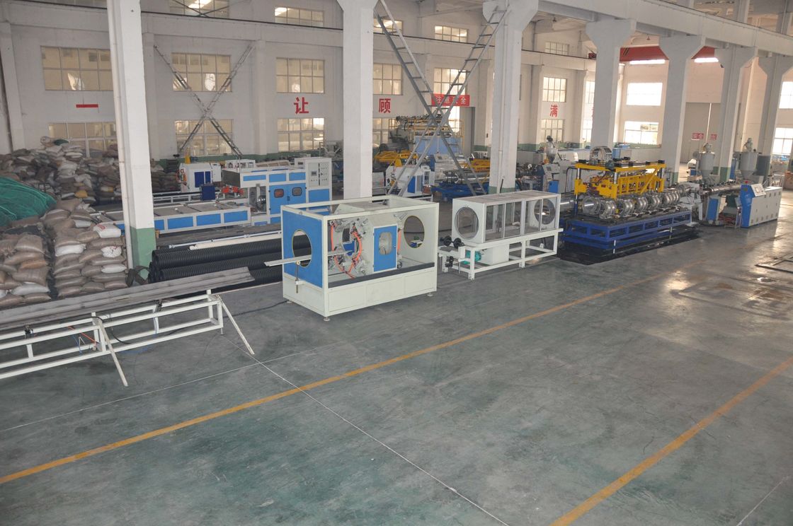 Nguyên liệu + phụ gia → trộn → máy cấp liệu chân không → máy sấy phễu → máy đùn trục vít đơn cho vật liệu PE / PP / máy đùn trục vít đôi cho vật liệu PVC → khuôn đùn ống + khuôn tạo hình ống sóng → máy tạo hình → máy kéo → máy cắt